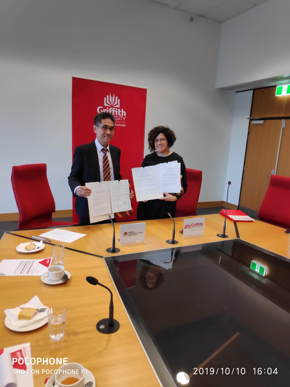 Penandatangan nota kesepahaman dilakukan oleh Agus Justianto dan Wakil President Griffith University Profesor Sarah Todd.