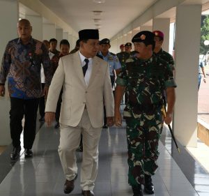 Kedatangan Menteri Pertahanan RI Bapak Prabowo Subianto beserta rombongan disambut Panglima TNI Marsekal TNI Hadi Tjahjanto dengan penuh keakraban dan kekeluargaan.