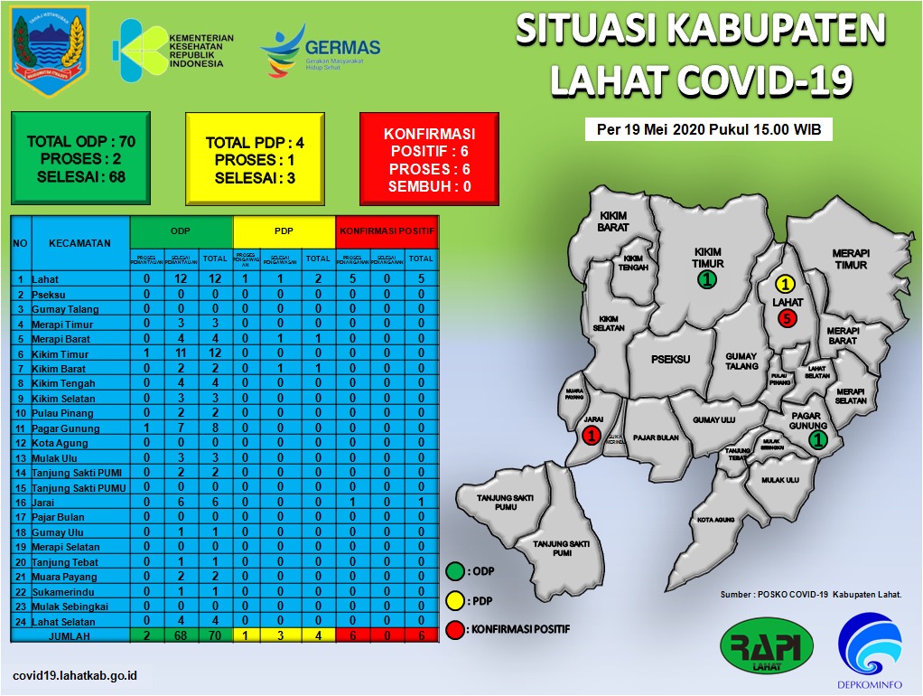 LAHAT, ENIMTV – Pemkab Lahat melalui Juru Bicara Gugus Tugas Percepatan Penanganan Covid-19 Lahat, Taufik M. Putra menyampaikan bahwa hingga hari ini Rabu (20/5/2020) jumlah pasien positif Covid-19 di kabupaten Lahat menjadi 6 orang.