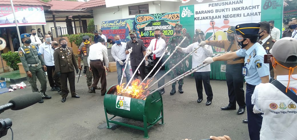 LAHAT, ENIMTV – Dalam rangka memperingati Hari Ulang Tahun (HUT) Adhyaksa ke-60, Kejaksaan Negeri (Kejari) Lahat memusnahkan ratusan barang bukti (BB) yang telah berkekuatan hukum tetap (inkracht), di Halaman Kantor Kejari Lahat, Rabu (22/7/2020).