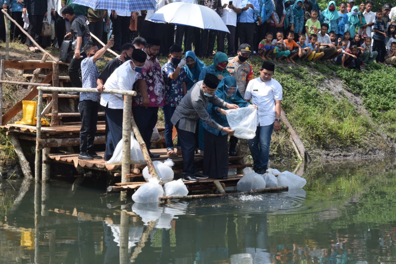 Sekitar 5.000 benih Ikan Tembakang dan 2.500 Ikan Baung dilepaskan Plt. Bupati dan Ketua TP PKK di Desa Sungai Duren.