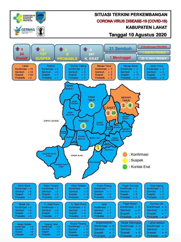 LAHAT, ENIMTV – Juru Bicara Percepatan Penanggulangan Covid-19 Pemkab. Lahat Taufiq M. Putra menyampaikan Update Perkembangan Covid-19 di kabupaten Lahat, Senin (10/8/2020).