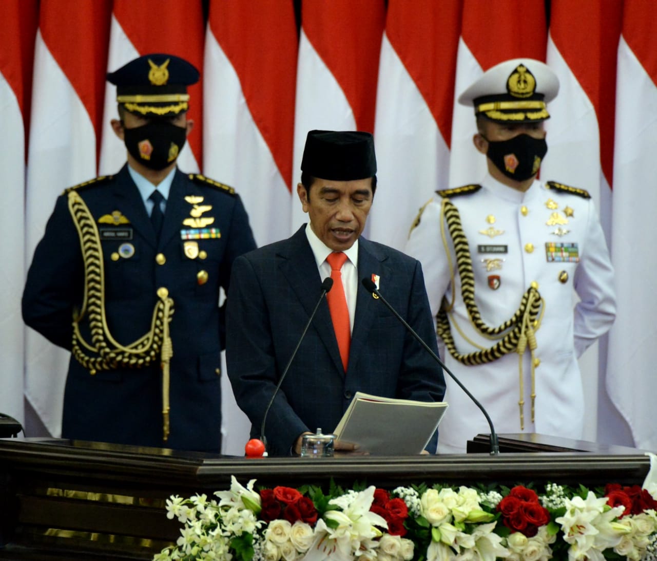 “Kita pun melakukan langkah yang luar biasa. Undang-undang Nomor 2 tahun 2020 antara lain memberi relaksasi defisit APBN dapat diperlebar di atas tiga persen selama tiga tahun,” ujar Presiden Joko Widodo saat menyampaikan Pengantar Pemerintah atas RUU APBN Tahun Anggaran 2021 pada Rapat Paripurna Pembukaan Masa Persidangan I DPR RI Tahun Sidang 2020-2021 di Ruang Rapat Paripurna, Gedung Nusantara MPR/DPR/DPD RI, Jakarta, pada Jumat, 14 Agustus 2020.