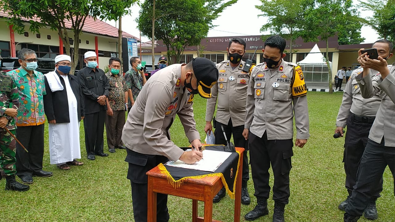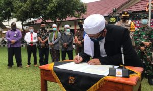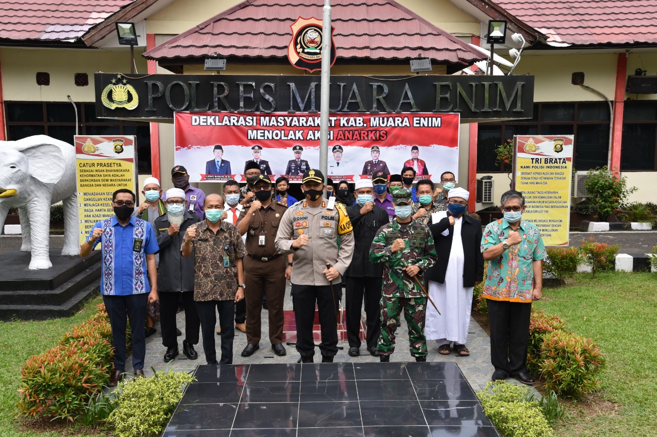 Kapolres Muara Enim AKBP Donni Eka Syaputra, S.H., S.I.K., M.M. bersama dengan Forkopimda dan tokoh masyarakat menyampaikan, “Kami Forkopimda dan Tokoh Masyarakat Kabupaten Muara Enim, dengan ini menolak dan menentang aksi anarkisme. Payo bersame kite jage kampung kite, mangko aman dan kondusif. Kalo bukan kite siape lagi, Muara Enim punye kite,” ucap peserta deklarasi tersebut. (*)