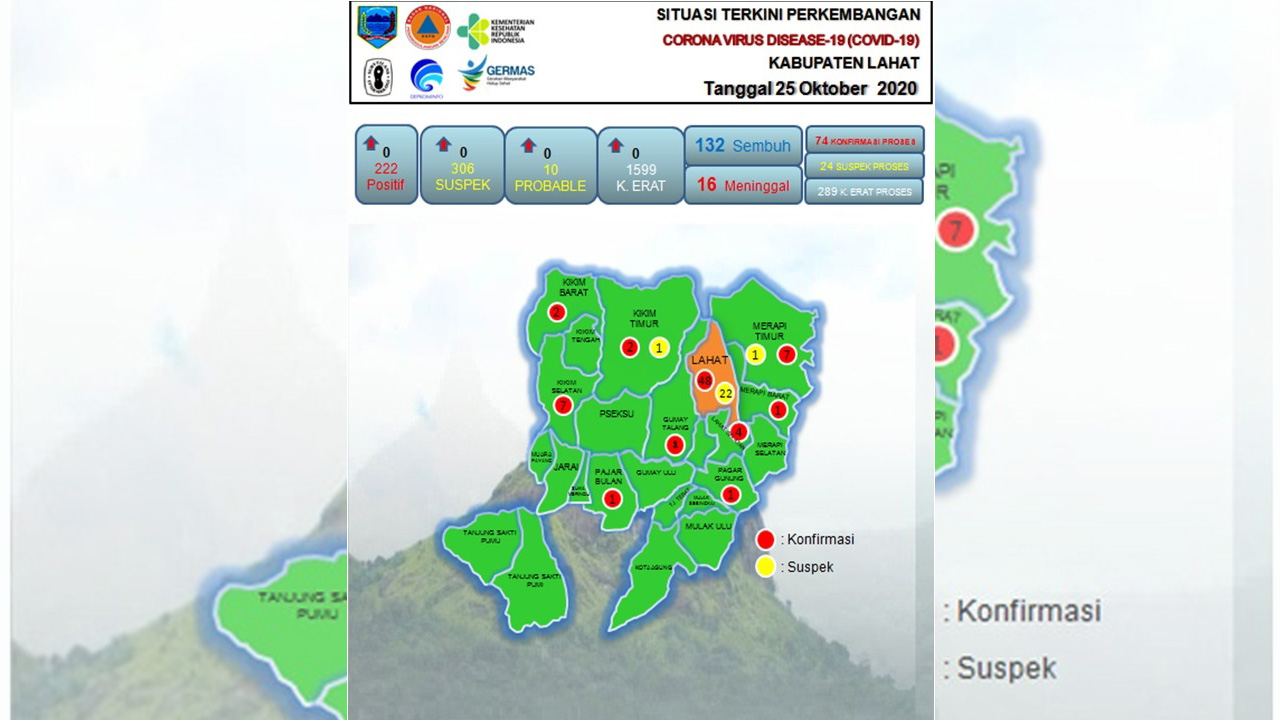 LAHAT, ENIMTV – Juru Bicara Percepatan Penanggulangan Covid-19 Pemkab Lahat, Taufik M. Putra menyampaikan Update Perkembangan Covid-19 di Kabupaten Lahat, Minggu (25/10/2020).