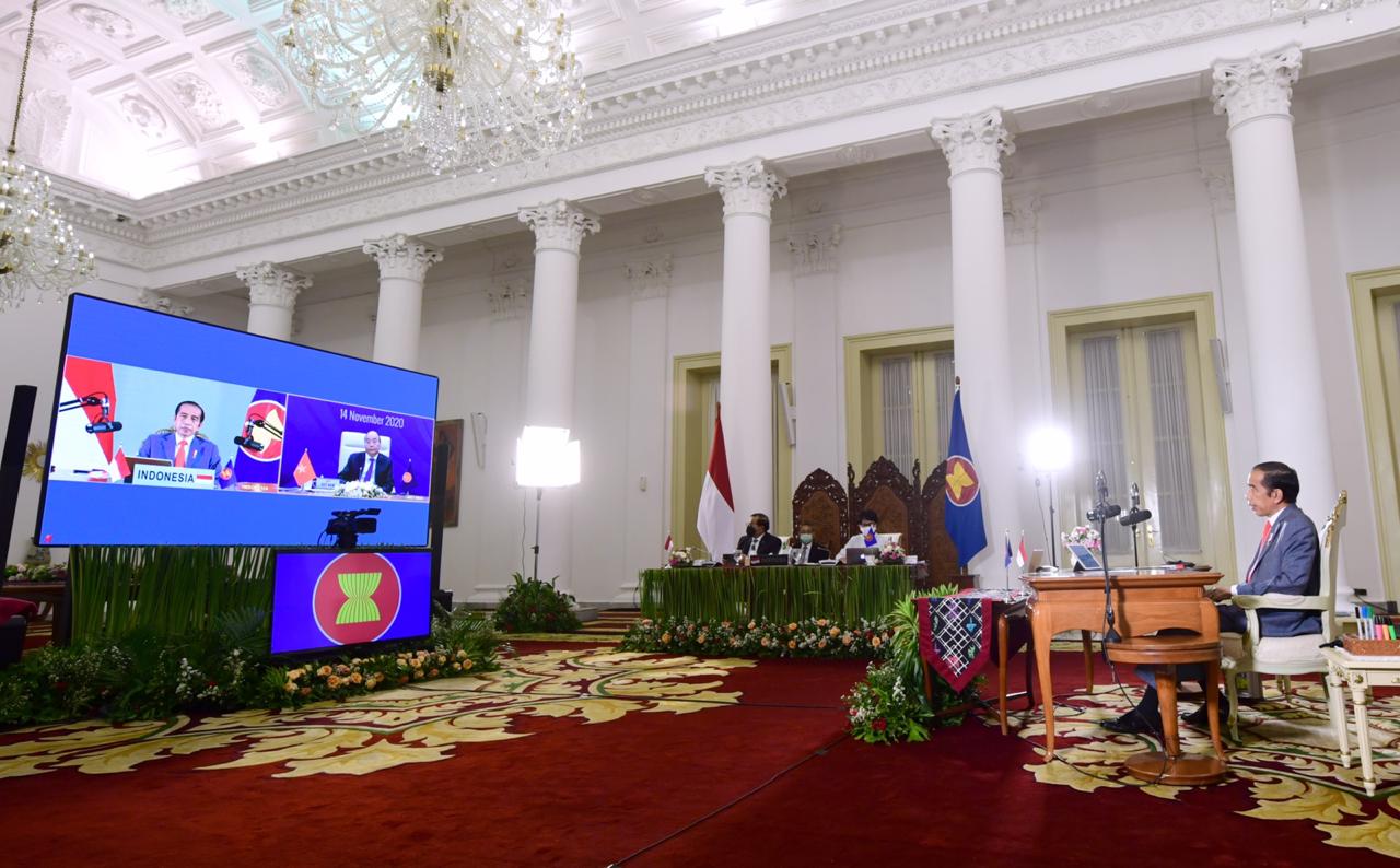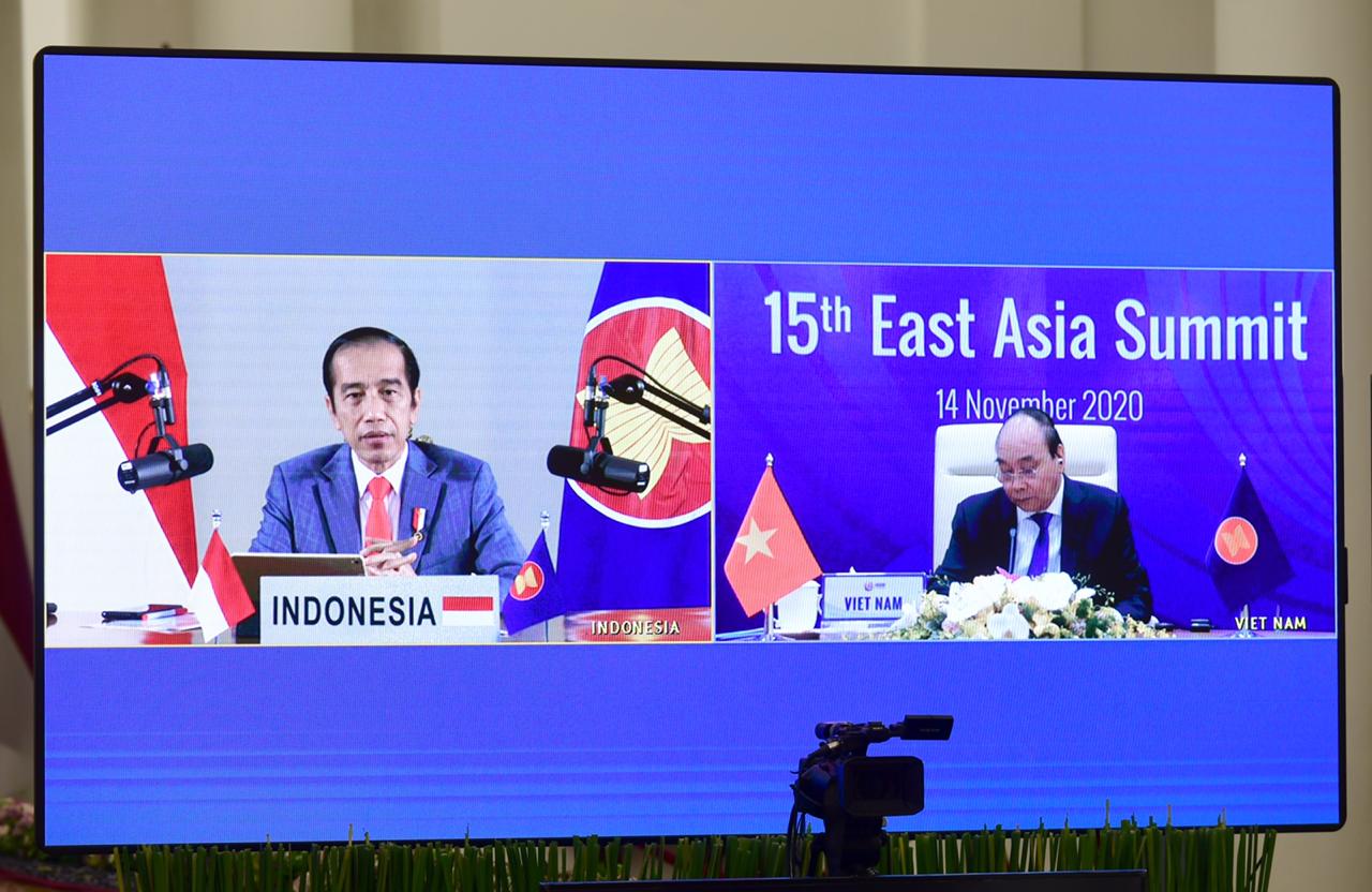 BOGOR, ENIMTV – Presiden Joko Widodo (Jokowi) terus mendorong dibangunnya kepercayaan strategis di antara negara anggota KTT Asia Timur untuk memperkuat kerja sama. Hal itu disampaikan Presiden dalam pidatonya secara virtual pada KTT ke-15 Asia Timur (EAS) pada Sabtu, 14 November 2020, dari Istana Kepresidenan Bogor, Jawa Barat.