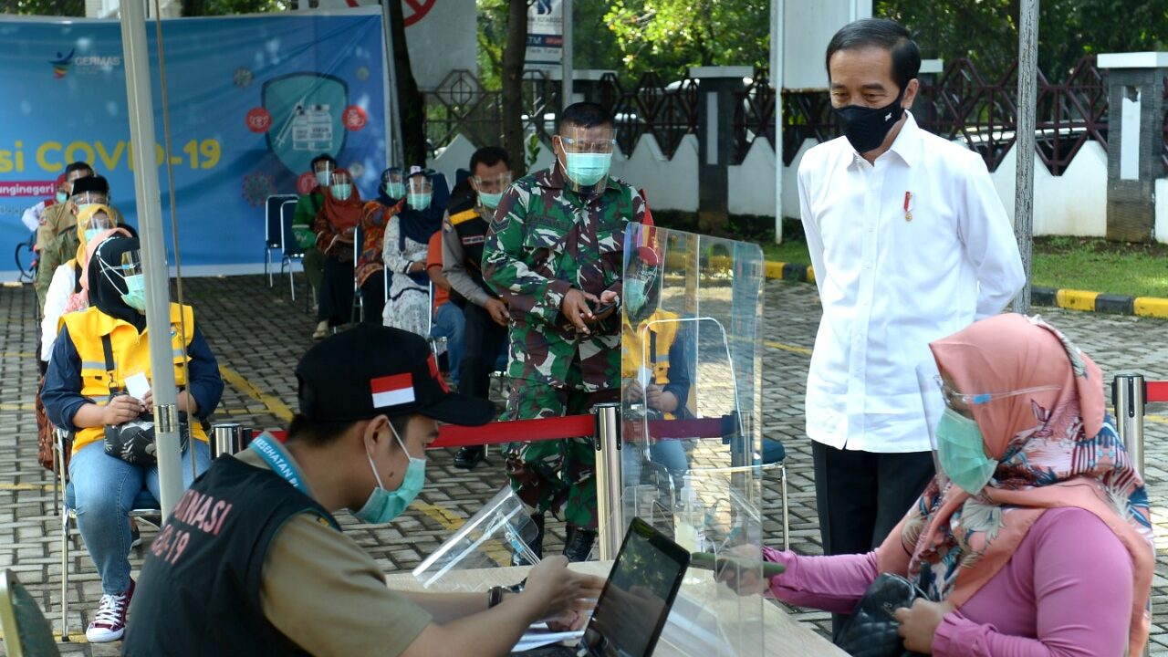 Setibanya di lokasi, Kepala Negara langsung meninjau proses simulasi vaksinasi dengan terlebih dahulu menuju tenda antrean di mana telah terdapat sejumlah warga yang sedang menunggu giliran pemeriksaan dengan tetap menerapkan protokol kesehatan. Setelahnya, Kepala Negara memasuki puskesmas untuk melihat langsung simulasi tindakan vaksinasi Covid-19 bagi warga yang telah melalui proses pemeriksaan dan verifikasi data.