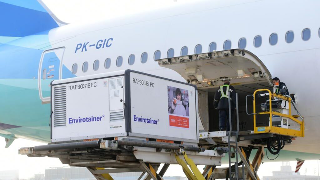 Vaksin tersebut sebelumnya telah dikemas menggunakan tempat penyimpanan khusus berupa envirotainer untuk menjaga kualitas vaksin. Sebanyak 1,2 juta vaksin dalam 7 envirotainer selanjutnya dimasukkan ke bagasi pesawat.