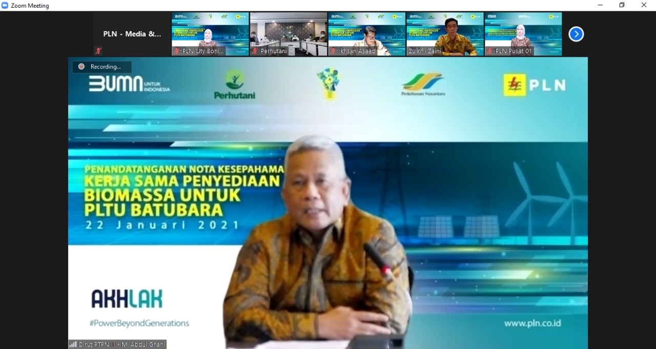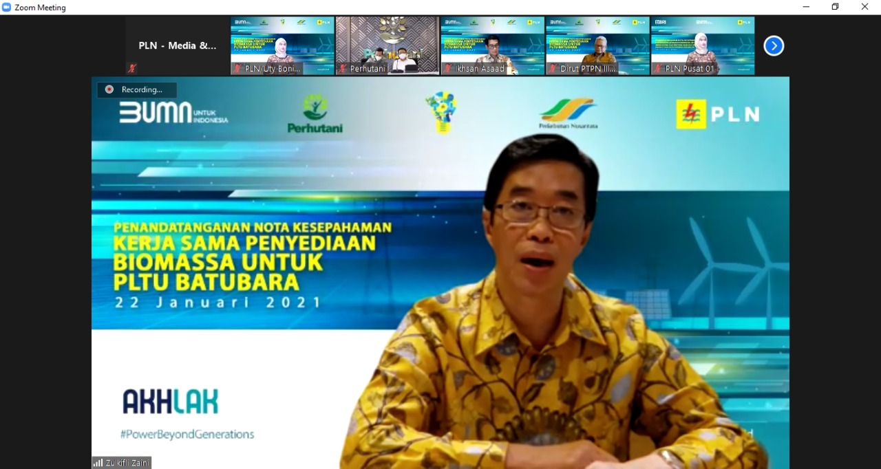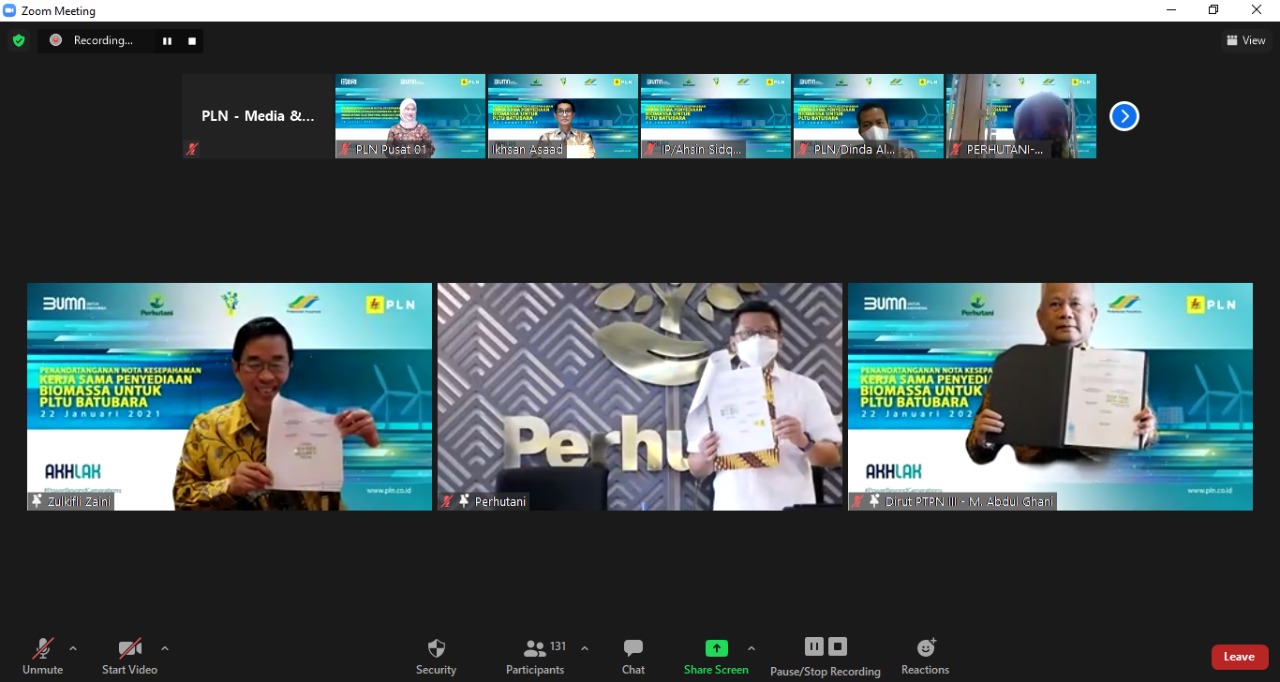 Diselenggarakan secara virtual, agenda ini dihadiri oleh Direktur Jenderal Energi Baru, Terbarukan dan Konservasi Energi Kementerian Energi dan Sumber Daya Mineral (Dirjen EBTKE KESDM), Dadan Kusdiana, Direktur Utama PLN Zulkifli Zaini, Direktur Utama Perhutani, Wahyu Kuncoro dan Direktur Utama PTPN III, Mohammad Abdul Ghani.