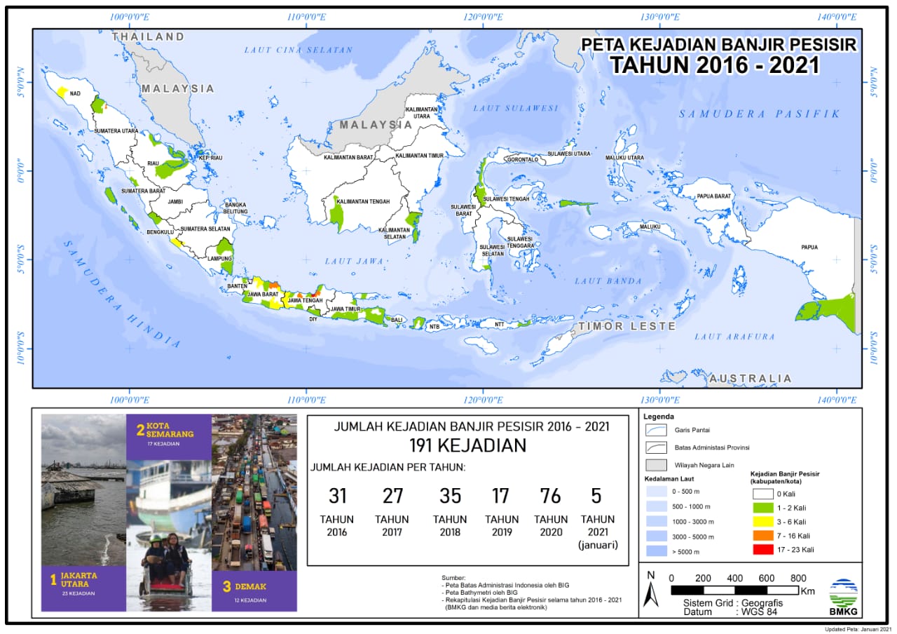 JAKARTA, ENIMTV – Angin dengan kecepatan cukup tinggi (9 – 46 km/jam) yang berhembus konsisten di Laut Jawa mengakibatkan peningkatan tinggi gelombang, utamanya di Perairan utara Jawa dengan ketinggian gelombang dapat mencapai 2,5 – 4,0 meter. Bersamaan dengan itu, adanya aktivitas bulan purnama berpengaruh terhadap kondisi pasang air laut maksimum yang berpotensi menyebabkan banjir pesisir (Rob) di beberapa wilayah pesisir utara Jawa. Seperti disampaikan Deputi Meteorologi BMKG Guswanto,26 Januari 2021 diantaranya :