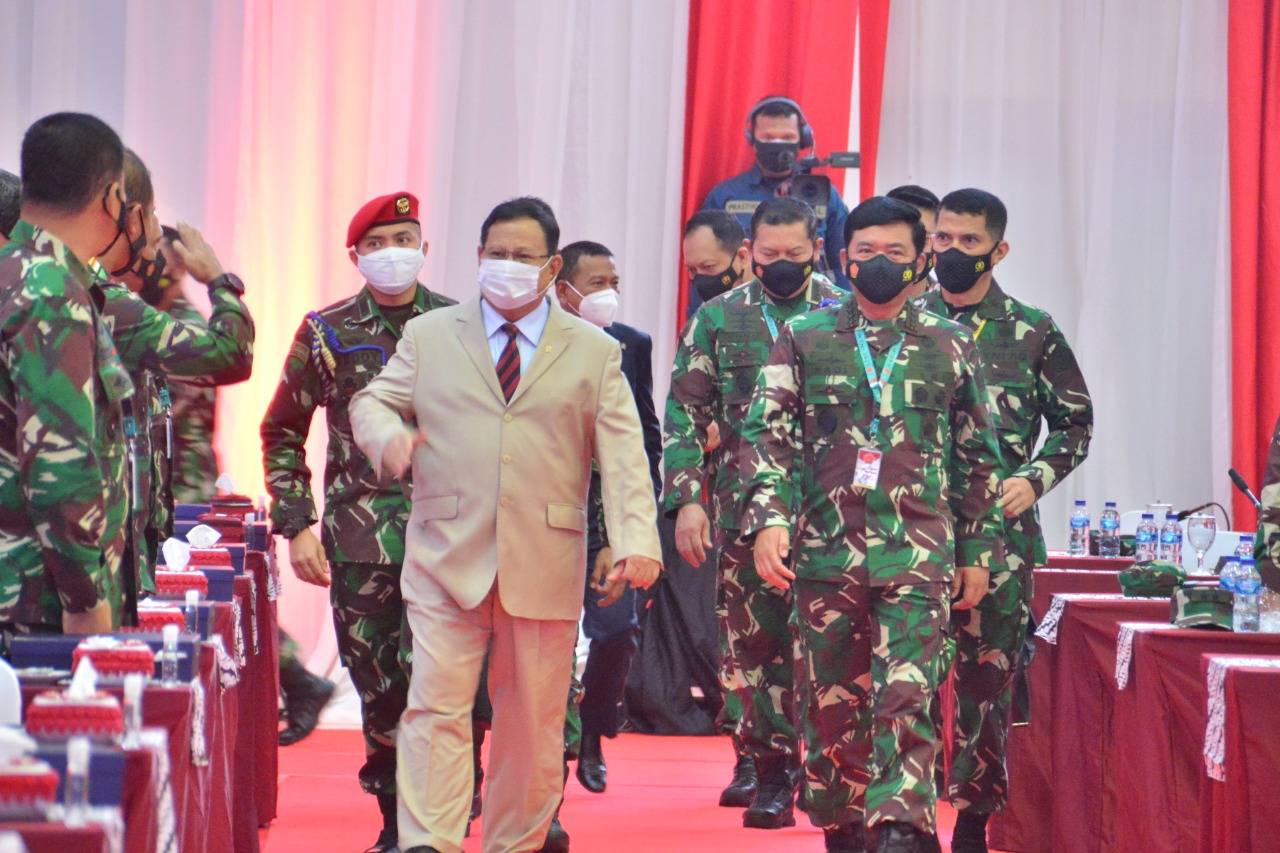 JAKARTA, ENIMTV – Menteri Pertahanan (Menhan) Prabowo Subianto memberikan pembekalan kepada peserta Rapat Pimpinan (Rapim) TNI Tahun 2021, di GOR Ahmad Yani, Mabes TNI Cilangkap, Selasa (16/2/2021).