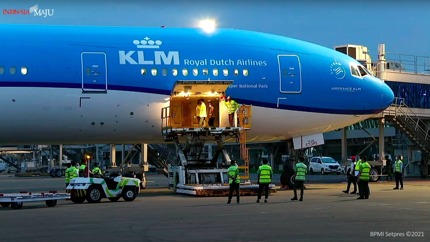 TANGERANG, ENIMTV – Pemerintah kembali mendatangkan vaksin COVID-19 untuk keperluan pelaksanaan vaksinasi bagi masyarakat Indonesia. Hari ini, Senin (08/03/2021) tiba di Tanah Air sebanyak 1,1 juta dosis vaksin AstraZeneca dalam bentuk jadi. Pesawat Maskapai KLM yang membawa vaksin tersebut dari Amsterdam, Belanda, mendarat di Bandar Udara (Bandara) Soekarno Hatta, Tangerang, Banten, sekitar pukul 17.50 WIB.