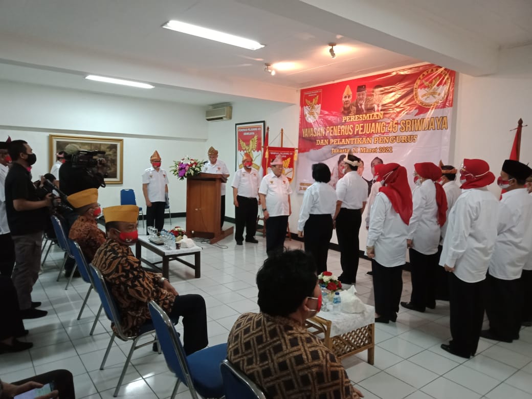 Acara Pelantikan dan Peresmian Yayasan Generasi Penerus Pejuang 45 Sriwijaya yang digelar di Gedung Juang 31 Menteng, Jakarta Pusat, Minggu (21/3/2021) ini dihadiri oleh Mayjen TNI (Purn) Nono Sukarno dan Laksda TNI (Purn) Banu Kastoyo (Kadep dan Wakadep Pewarisan JSN 45). (AWDI)