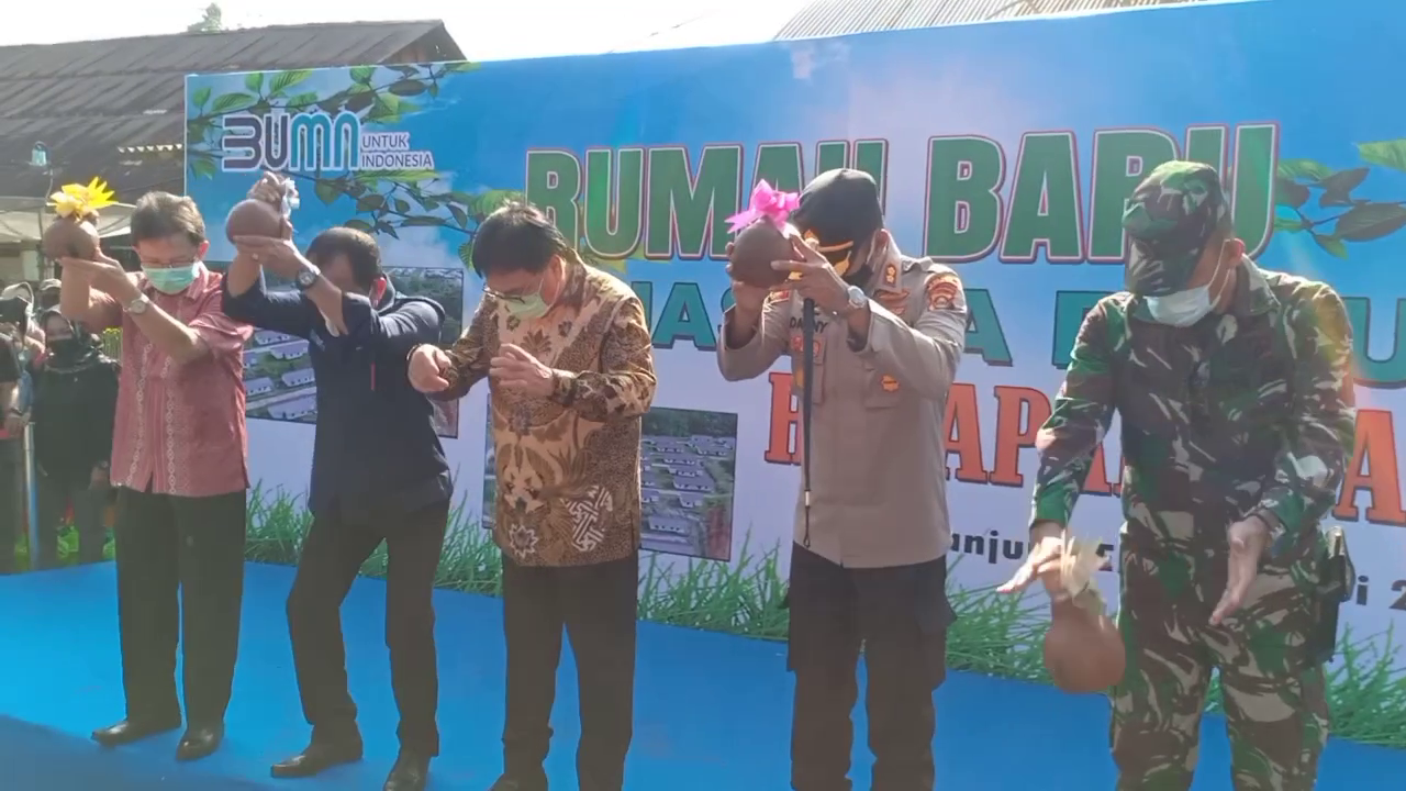 Proses relokasi dimulai secara simbolis ditandai dengan penyerahan kunci kepada perwakilan warga dan pemecahan kendi yang dilakukan oleh Dirut PTBA bersama Plh Bupati Muara Enim, Ketua DPRD Muara Enim, Kapolres Muara Enim, dan Danramil 404-05 Lawang Kidul. (Aal)