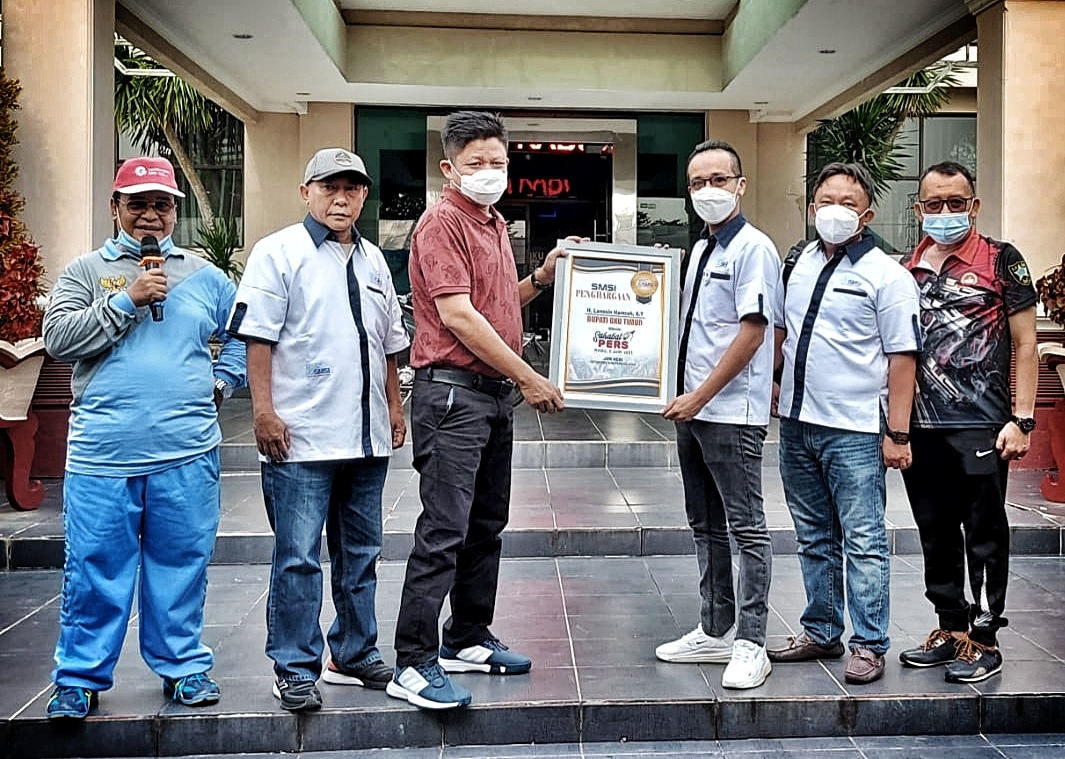 Piagam penghargaan diserahkan oleh Ketua SMSI OKU Timur Elvandri Jefriadi, S.Kom., usai orang nomor satu di Bumi Sebiduk Sehaluan melaksanakan kegiatan senam pagi bersama Wakil Bupati HM Adi Purna Yudha, S.H., Sekda Jumadi, S.Sos., Kepala OPD dan pegawai, Jumat (11/06/2021).