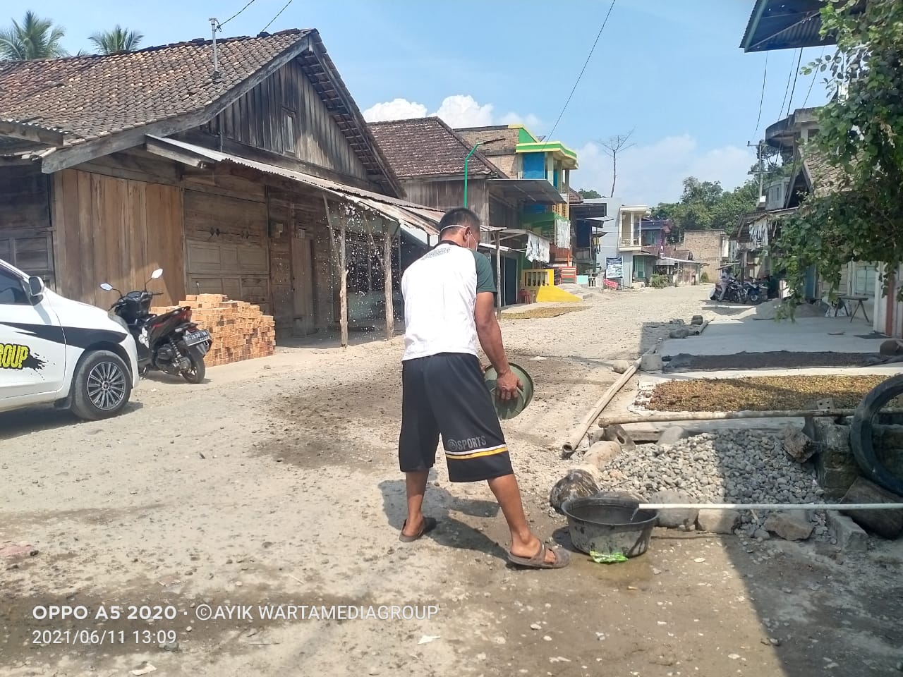 Warga setempat menyiram jalan di depan rumah masing-masing menggunakan ember untuk meminimalisir terjadinya polusi debu yang mengancam kesehatan mereka.