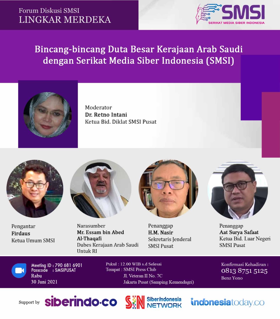 Acara diskusi dan bincang-bincang virtual SMSI-Dubes Arab Saudi untuk Indonesia dengan moderator Ketua Bidang Diklat SMSI Dr Retno Intani itu juga dihadiri oleh Ketua Umum SMSI Firdaus dan Sekjen SMSI M. Nasir dan Ketua Bidang Luar Negeri SMSI Pusat Aat Surya Safaat. (SMSI)