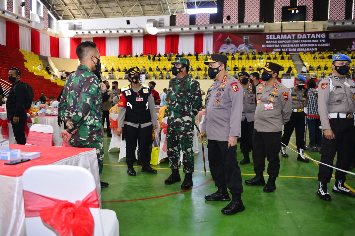 JAKARTA, ENIMTV – Panglima TNI Marsekal Hadi Tjahjanto bersama Kapolri Jenderal Listyo Sigit Prabowo meninjau pelaksanaan Vaksinasi Merdeka Candi di Semarang, Jawa Tengah, Kamis, (5/8/2021). Kegiatan ini salah satu upaya akselerasi vaksinasi sebagai hadiah di hari Kemerdekaan Republik Indonesia (RI) ke-76.