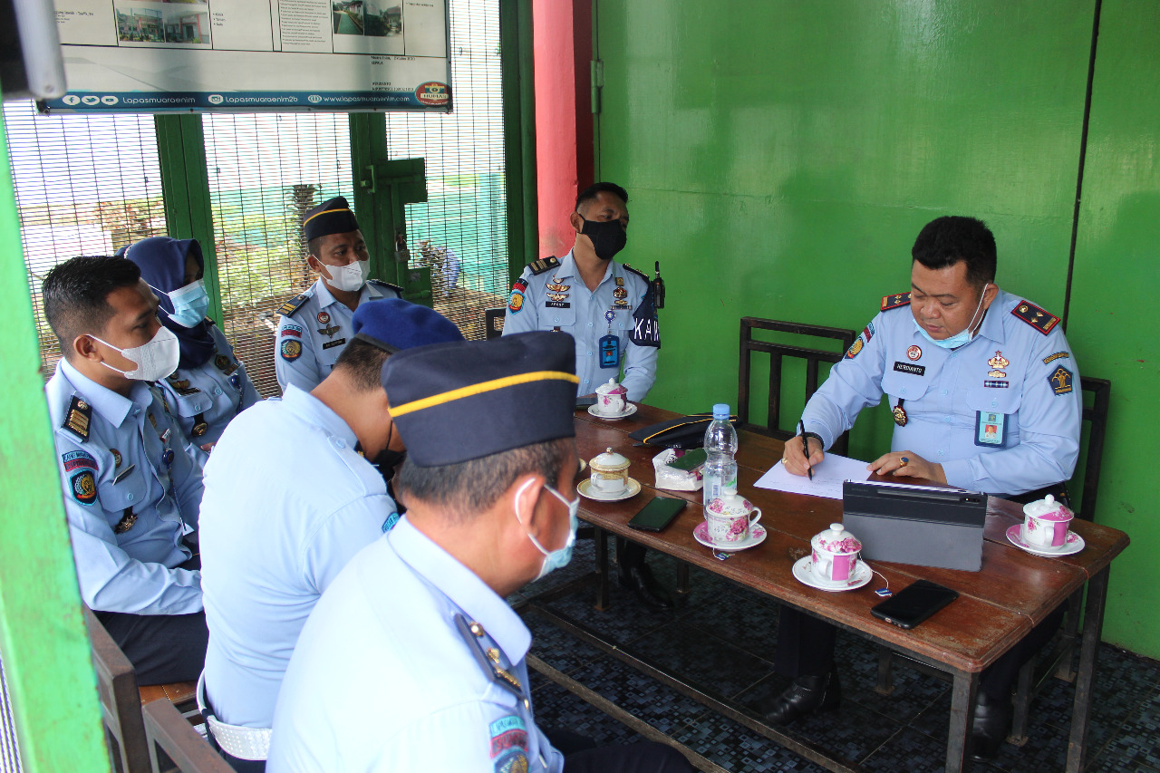 MUARA ENIM, ENIMTV – Seusai melaksanakan Apel Pagi Rutin, Kepala Lembaga Pemasyarakatan (Kalapas) Kelas IIB Muara Enim Herdianto memberikan arahan kepada seluruh Pejabat Struktural Lapas Muara Enim, pada kegiatan Monitoring dan Evaluasi (Monev) Akhir Tahun. Senin (13/12/2021).