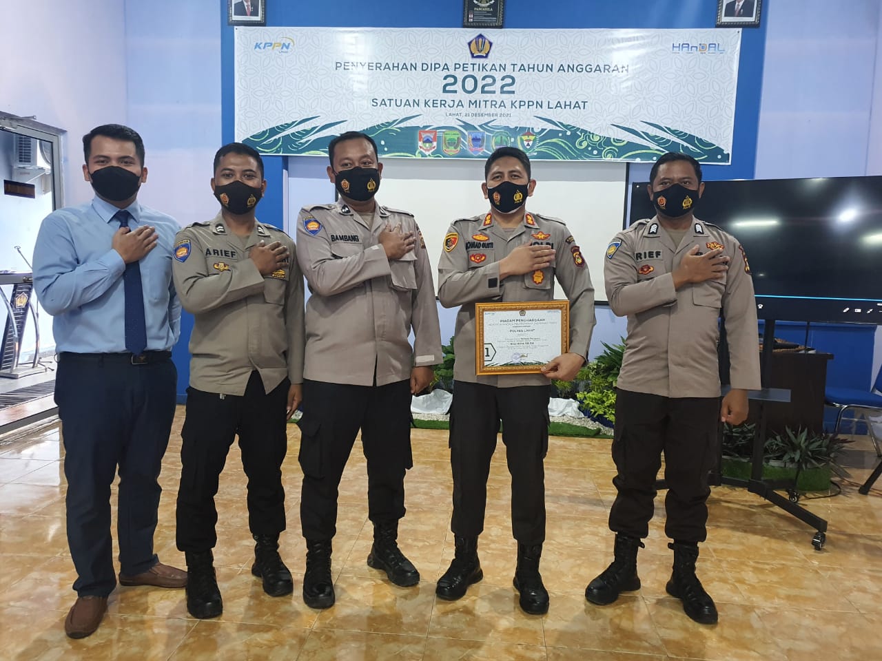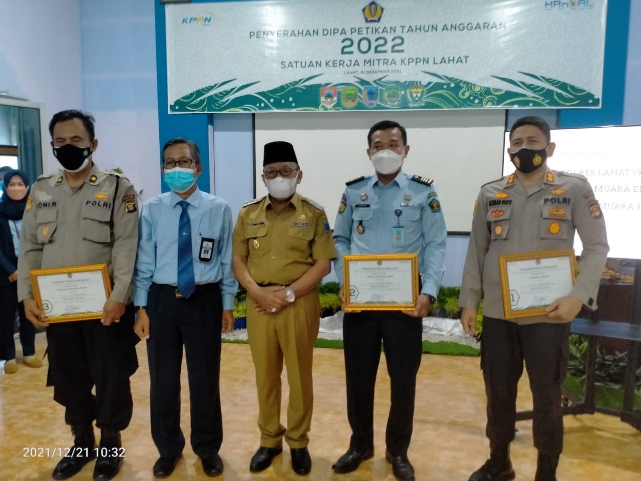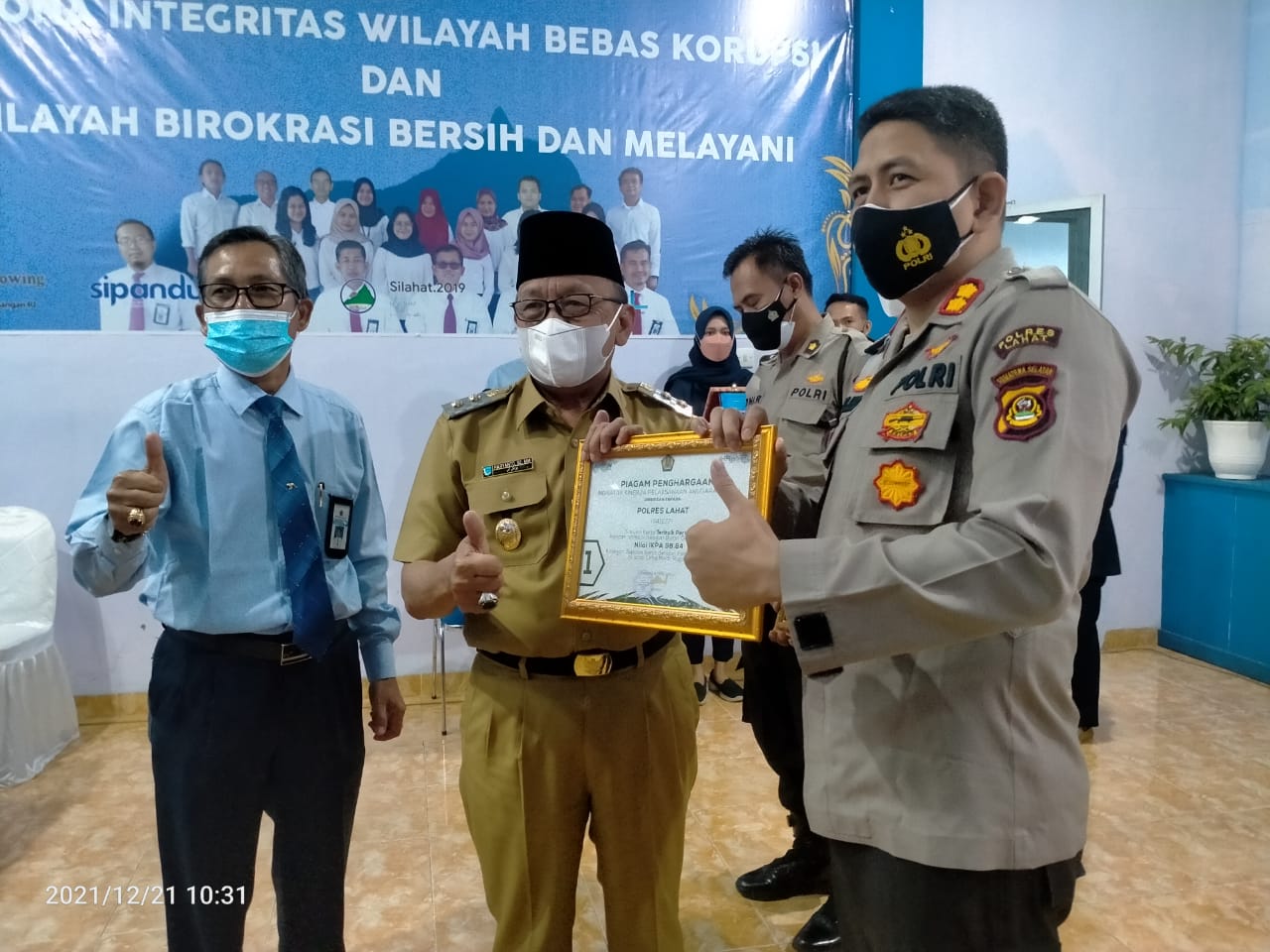 Penghargaan tersebut diberikan langsung oleh Wakil Bupati Lahat H. Haryanto, S.E., M.M. didampingi oleh Kepala KPPN Lahat Amber, kepada Kapolres Lahat AKBP Achmad Gusti Hartono, S.I.K. didampingi Kasi Keuangan Polres Lahat Aipda Bambang Susilo.