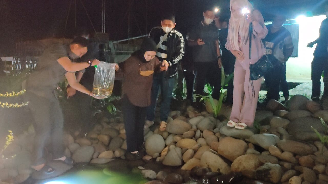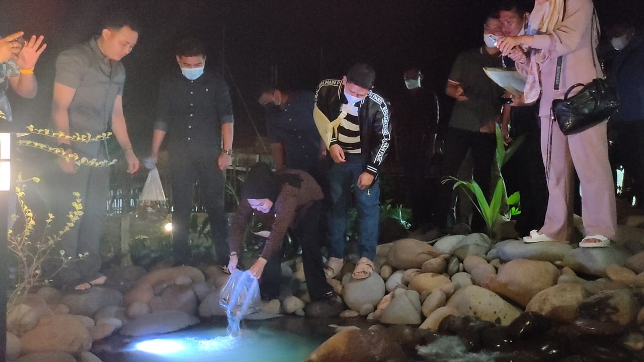 Setelah penandatanganan prasasti, acara dilanjutkan dengan penebaran ikan Koi oleh Kapolres lahat didampingi Wakapolres Lahat beserta ibu dan Kasat Lantas Polres Lahat.