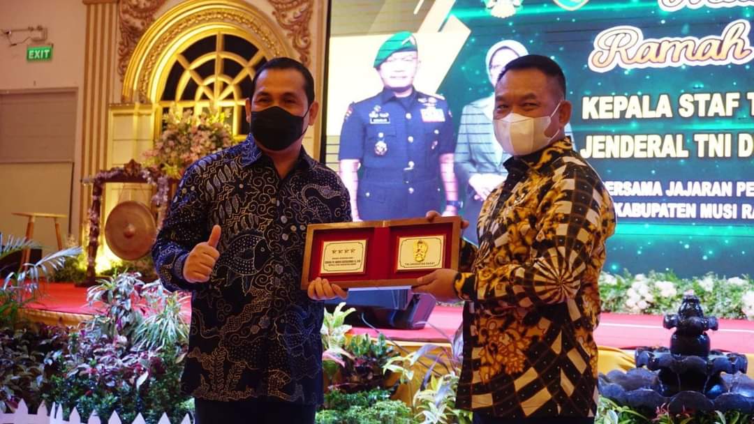 LUBUKLINGGAU, ENIMTV – Kepala Staf Angkatan Darat (KSAD) Jenderal TNI Dudung Abdurachman mendapat gelar kehormatan “Pangeran Ulu Bela Penjege Negeri” dari Lembaga Penasehat Adat Kota Lubuklinggau pada malam ramah tamah KSAD Jenderal Dudung Abdurachman didampingi Ketua Umum Persit Kartika Chandra Kirana, Ny Rahma Setyaningsih dengan Forkopimda Lubuklinggau, Musi Rawas, Musi Rawas Utara, bertempat di Hotel Dewinda, Selasa (8/3/2022) malam.