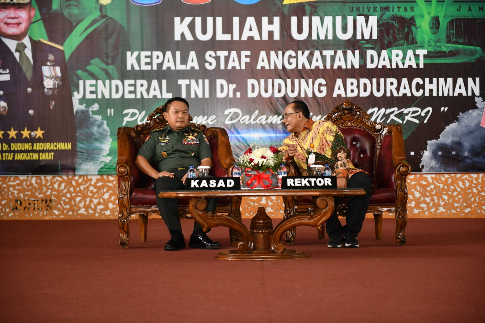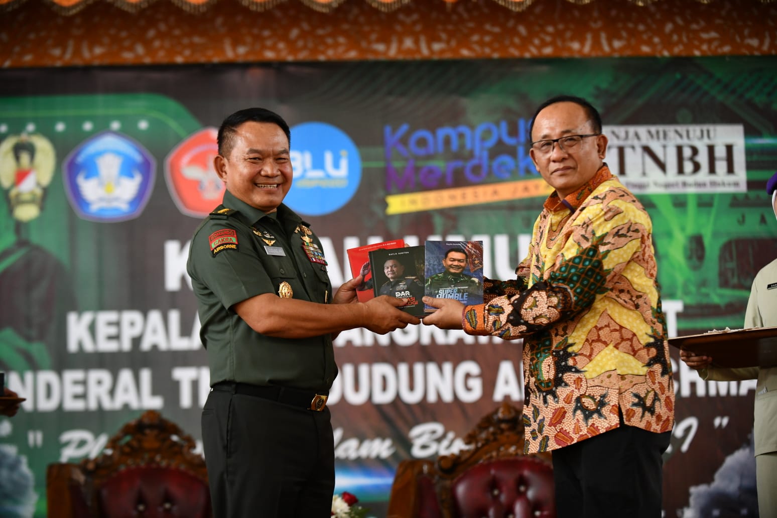 Usai memberikan kuliah umum, Kasad memberikan tiga buah buku yang ditulisnya secara simbolis kepada Rektor Universitas Jambi Prof. Drs. H. Sutrisno, M.Sc., Ph.D., yaitu buku berjudul Loper Koran Jadi Jenderal, kemudian buku berjudul Dudung Abdurachman Membongkar Operasi Psikologi Gerakan Intoleransi dan buku yang ketiga berjudul Super Humble.