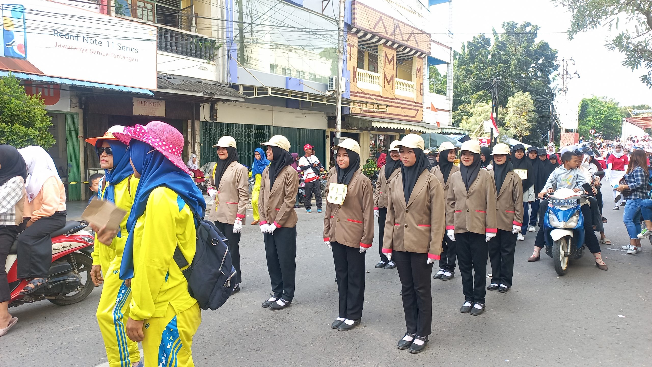 Para peserta Lomba Gerak Jalan Indah tampak sangat bersemangat menampilkan yel-yel gerakan variasi di hadapan dewan juri yang menunggu di pos-pos yang telah ditentukan, salah satunya pos yang berada di Jalan Jenderal Sudirman depan Tugu Pahlawan.