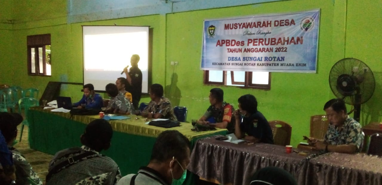 MUARA ENIM, ENIMTV – Dalam rangka membahas APBDes Perubahan Tahun Anggaran 2022, Pemerintah Desa (Pemdes) Sungai Rotan, Kecamatan Sungai Rotan, Kabupaten Muara Enim menggelar Musyawarah Desa (Musdes) di Gedung Serba Guna Desa Sungai Rotan, Kamis (22/9/2022).