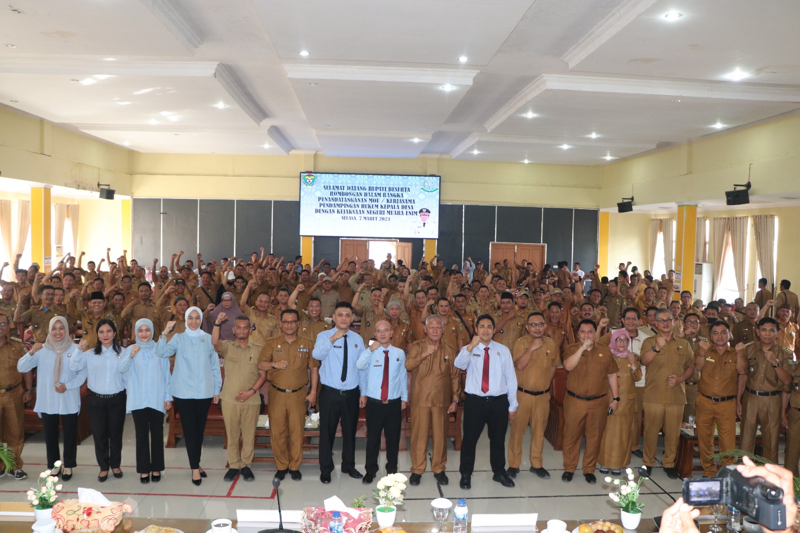 Penandatangan MoU dilakukan oleh Kajari Muara Enim dengan perwakilan Ketua Forum Kades tiap kecamatan, serta disaksikan Pj Sekda Muara Enim, Kepala Dinas PMD, dan perwakilan Inspektorat.