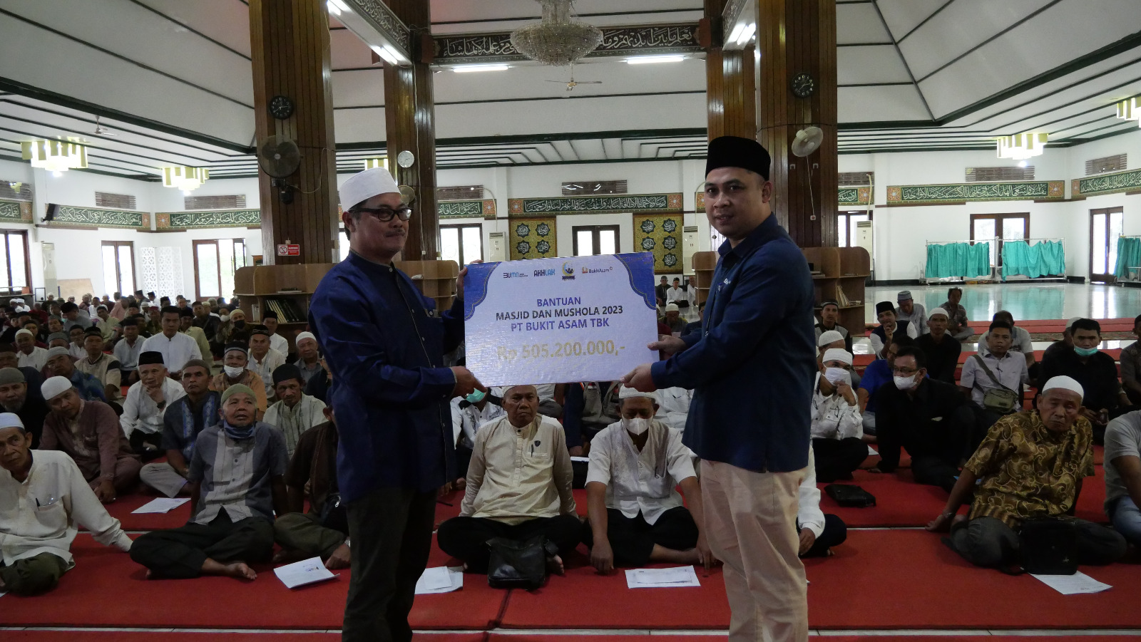 Bantuan diberikan secara simbolis oleh Wakil Ketua Panitia Ramadan PTBA Ihwani Maris dan VP Pengadaan Aset & Infrastruktur Sipil Penunjang PTBA Ichsan Aprideni kepada pengurus DKM Masjid dan Musala di Masjid Jamik Bukit Asam, Tanjung Enim, Selasa (11/4/2023).
