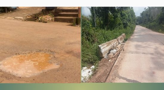BANYUASIN, ENIMTV – Jalan rusak diduga dilewati oleh kendaraan bertonase berat yang