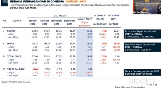 Neraca Perdagangan Indonesia Januari 2021 Catatkan Surplus 1,96 Miliar Dolar AS Berita, Nasional|26 Februari 2021oleh redaksi enim Menteri Perdagangan (Mendag) Muhammad Lutfi mengatakan, neraca perdagangan pada Januari 2021 kembali